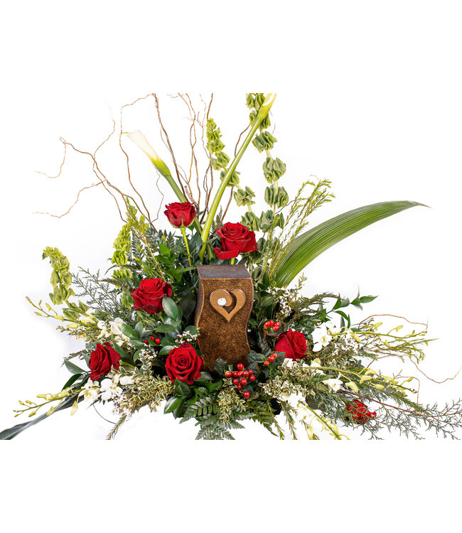 Rose asst. Calla blanc , Molucela, Dendrobium blanc/bleu, Hypericum rouge/vert/rose/blanc, Curly willow (salix), Accordéon, Ruscus israeli, Aspidistra, Sapinage, Myrtle Lire plus.