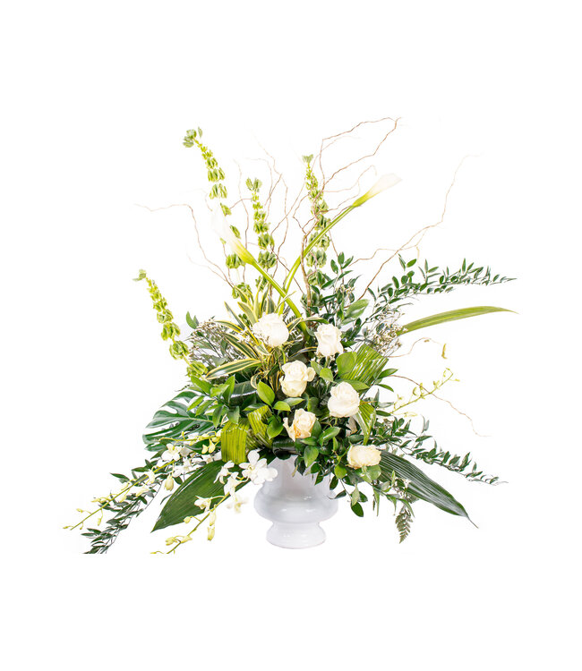 Rose asst, Calla blanc, Molucela, Caspia, Dendrobium blanc/bleu, Song of india, Accordéon, Ruscus italien, ruscus israël, Aspidistra, salix