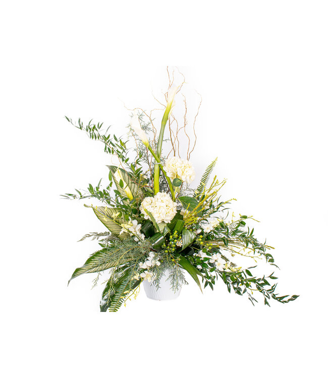 Calla blanc, Hydrangea, Calathea, Dendrobium blanc/bleu, Hypericum berries branchu, Aspidistra, Accordéon, Ruscus italien, carolina saphir, fougère, salix, honey bracelet, Wax asst. Lire plus.