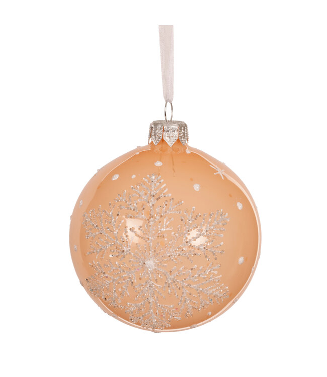 Plongez dans la magie d’un Noël doux et lumineux avec cette magnifique boule de verre couleur pêche décorée d’un flocon délicat de 3 po.