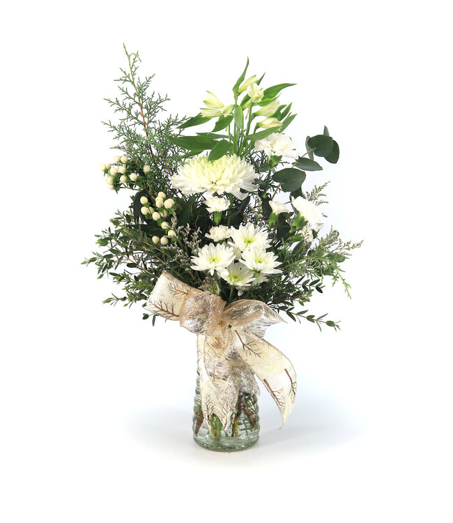 Offrez un moment de calme et de beauté avec Éclat de Neige, un bouquet blanc lumineux inspiré par la douceur de l’hiver. Cette création florale marie l’élégance des alstroemerias blancs et la rondeur délicate des chrysanthèmes pompons blancs, accompagnés de mini-œillets blancs pour une touche tendre et texturée. Les hypericums blancs ajoutent un accent subtil et raffiné, comme de petites perles d’hiver au cœur de la composition.