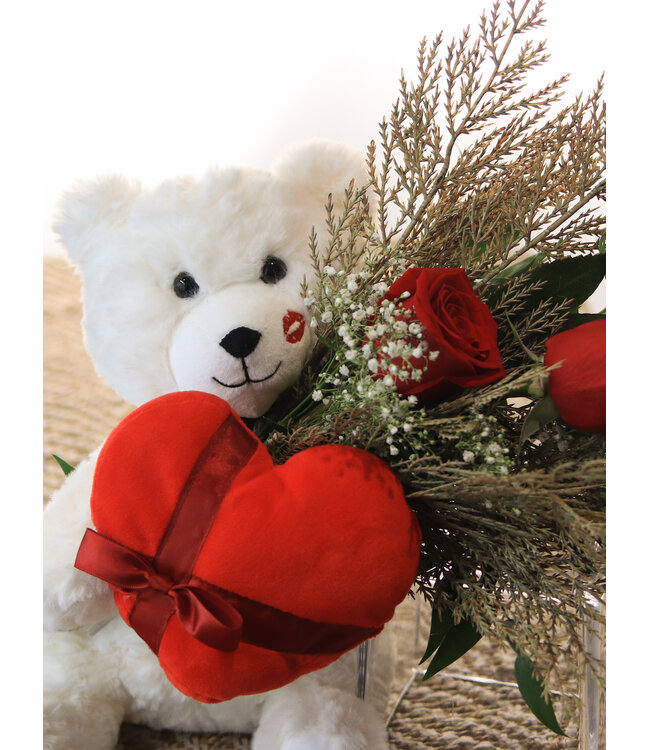 Plongez dans un univers de douceur avec le bouquet Gros Câlin. Cette composition exquise marie la passion des roses rouges aux teintes chatoyantes des baies, le tout sublimé par un feuillage délicat. Niché au cœur de cet arrangement, un ourson en peluche attend de transmettre vos sentiments les plus tendres. Que ce soit pour déclarer votre amour, exprimer votre gratitude ou offrir un moment de réconfort, ce bouquet est le messager idéal de vos émotions.