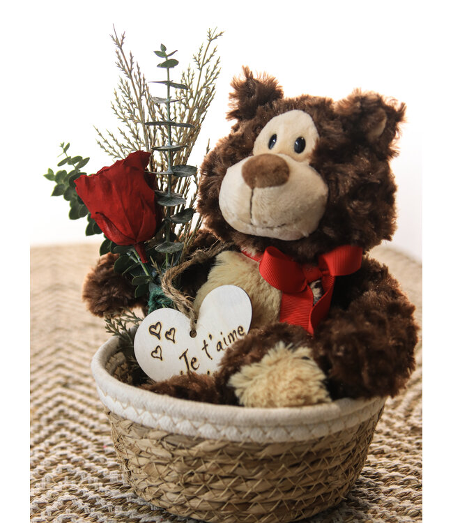 Plongez dans un univers de tendresse avec "Mon Ti-Ours". Accompagnée d'un adorable ourson en peluche, une rose préservée, de l'eucalyptus frais et un pampass. Le tout est délicatement arrangé dans un panier en osier. Bien que la sélection des fleurs puisse varier en fonction des disponibilités saisonnières, nous veillons à préserver l'harmonie des couleurs et l'esthétique générale du bouquet, garantissant ainsi une expérience visuelle tout aussi envoûtante.