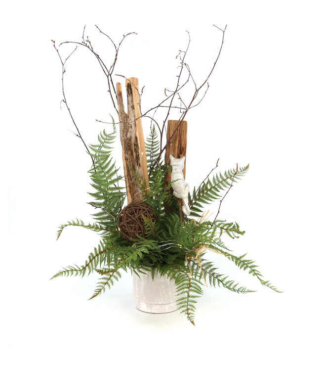 Réalisée avec des végétaux synthétiques réalistes, dont de riches fougères et feuillages décoratifs, la composition conserve un aspect naturel tout en étant durable et sans entretien. Les branches et pièces de bois apportent une texture authentique et un style inspiré de la nature.