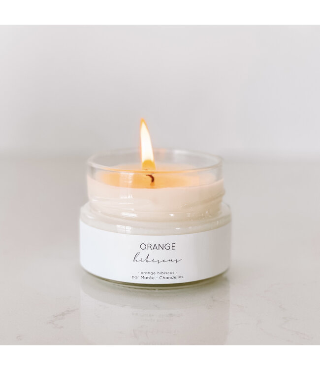 Fait au Québec par la compagnie Marée Chandelles, cette chandelle saura vous charmer avec son mélange d'orange et d'hibiscus.