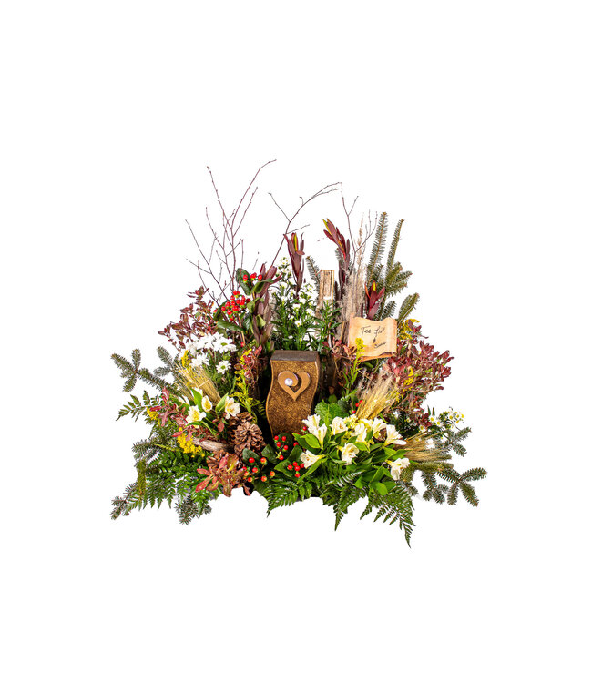 Leucadendron, Alstromeria, Chrysanthemum hollande, solidago, Hypericum berries branchu, aster blanche, Aspidistra, ruscus israël, graminé, branche bouleau, sapin, verdure bourgeone Lire plus.