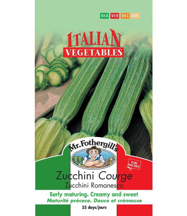 Bonne récolte de courgettes à rayures, attrayantes et tendres. Les fleurs sont comestibles. Semez 4 semaines avant le dernier gel ou directement au jardin une fois le sol réchauffé.