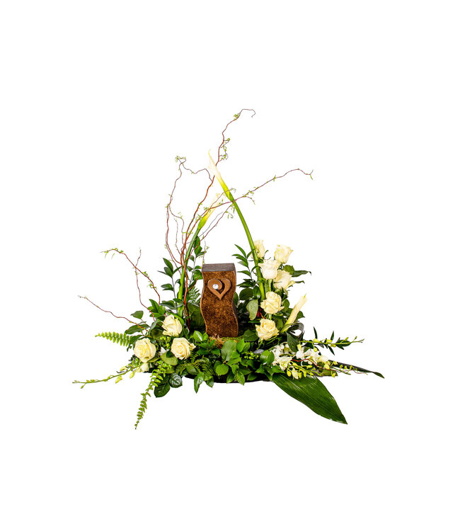 Calla blanc, Rose asst., Dendrobium blanc/bleu, fougère, ruscus israël, Salal, salix, Aspidistra Lire plus.