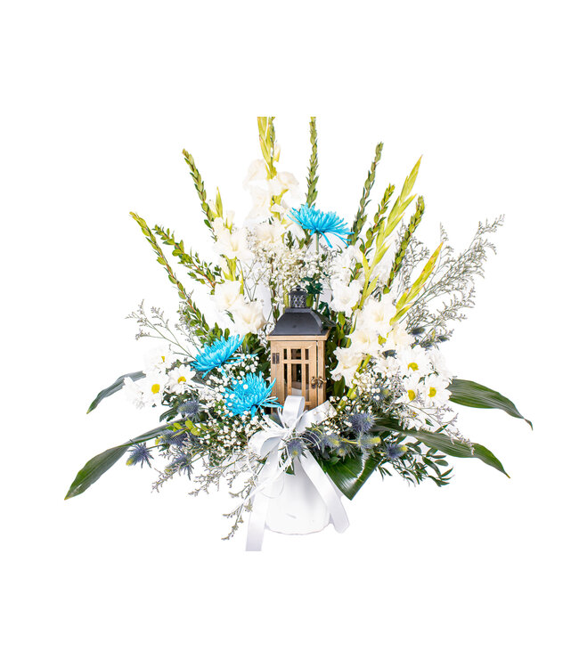 4 glaieul,mum teint, marguerites, eringium, caspia, gypsophiles, aspidistra, myrtle, lanterne Lire plus.
