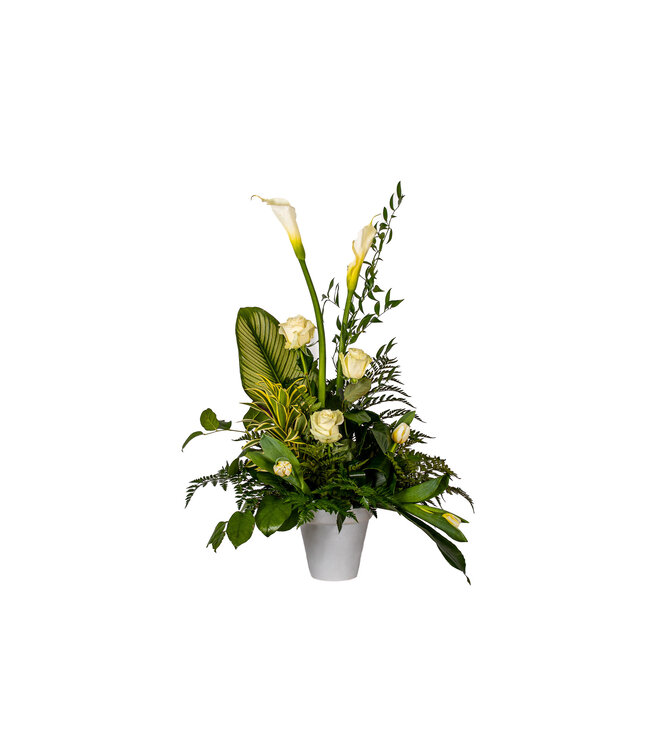 Rose asst, Calla blanc, Tulipe asst, Calathea, Song of india, Ruscus italien, Salal, Aspidistra