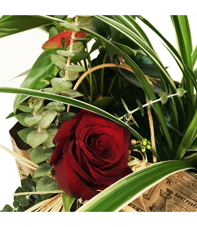Pour dire je t'aime à votre douce moitié offrez lui un magnifique arrangement de plantes naturelles accompagnées d'une roses rouge.