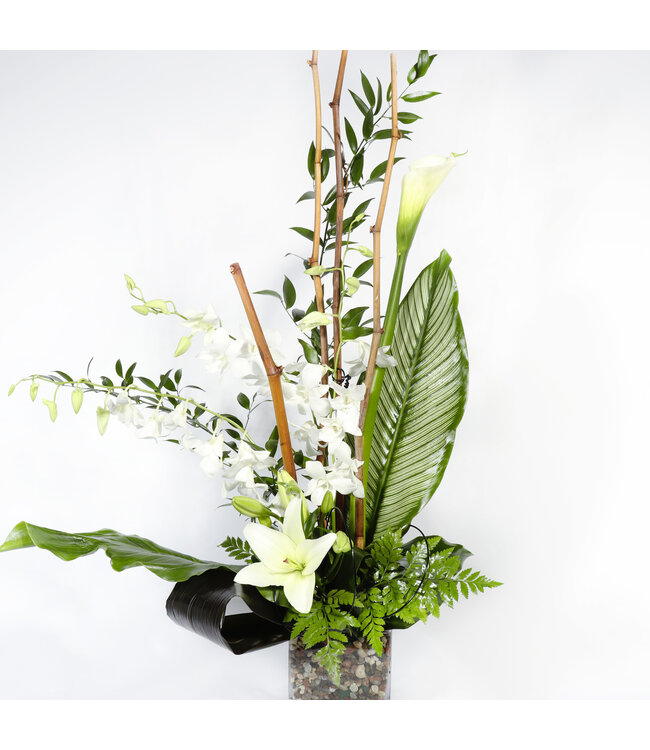 Cet arrangement comprend : lys, dendrobium, calla, feuille de calattea, feuille de calla, bamboo, aspidistra, ruscus, broche noire, vase cube en verre et roches.