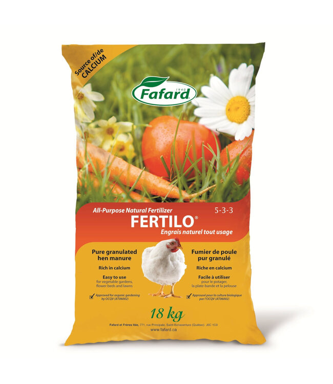 L'Engrais granulé tout usage Fertilo 5-3-3 de Fafard est une solution naturelle et efficace pour nourrir vos plantes. Composé à 100 % de fumier de poule déshydraté et granulé, il est riche en azote, phosphore, potassium et calcium, essentiels pour une croissance saine.