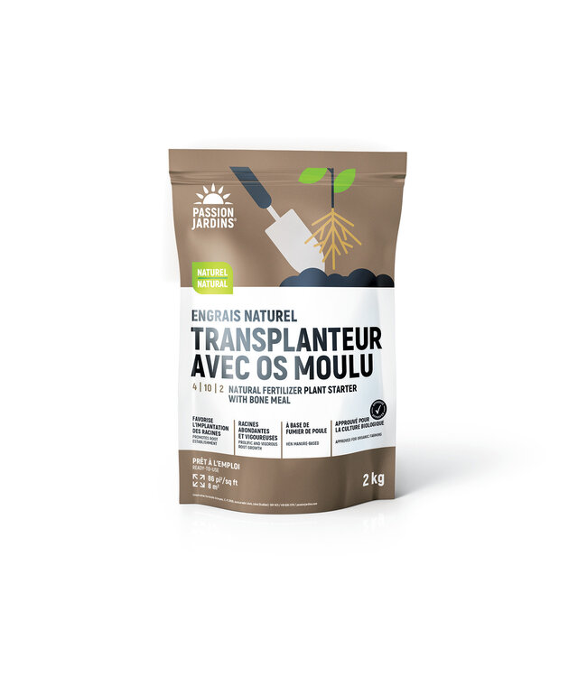 L'engrais transplanteur avec os moulu 4-10-2 est spécialement formulé pour assurer une reprise rapide et efficace lors de la transplantation de vos végétaux. Composé de fumier de poule et d'os moulu, il fournit une source riche en phosphore, essentielle au développement racinaire. Sa teneur en matière organique améliore la structure du sol, favorisant ainsi une meilleure rétention d'eau et une nutrition prolongée.