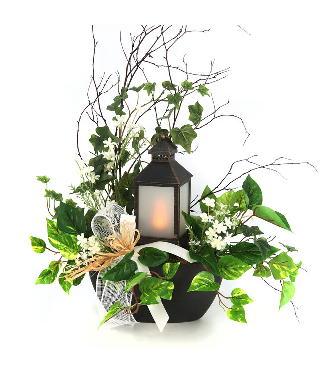 Offrez un hommage durable et apaisant avec ce montage funéraire composé de feuillages, branches et fleurs synthétiques au rendu réaliste, accompagné d’une lanterne à effet flamme dansante d’un réalisme saisissant.