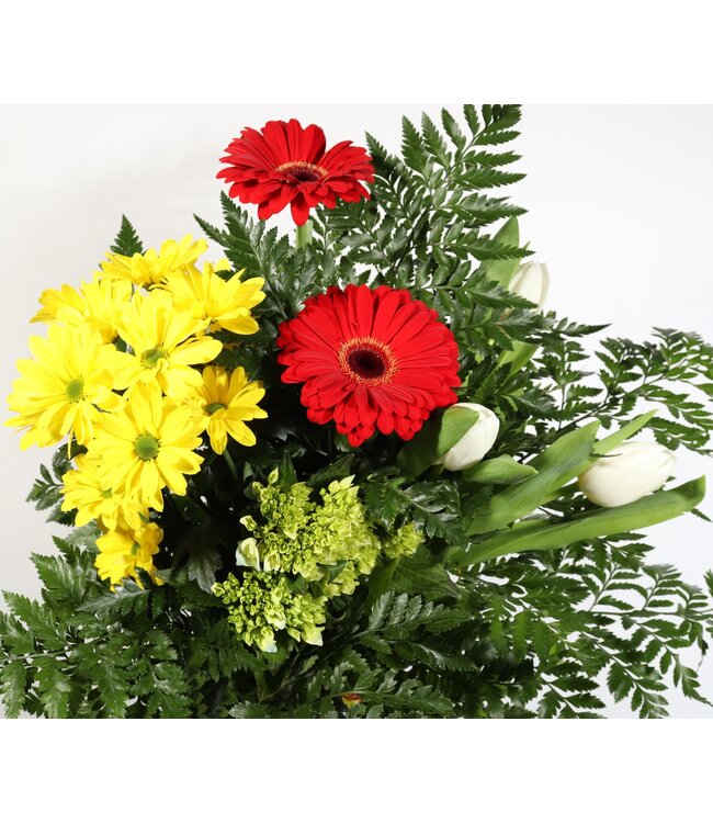 Ce bouquet comprend : Hydrangea, gerbera, marguerite et tulipes.