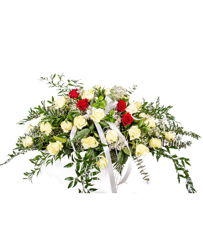 roses blanche et roses rouges, gypsophile, ruscus italien, eucalyptus, ruscus israel