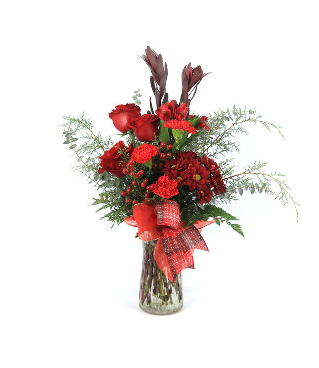 Découvrez Harmonie d’hiver, un bouquet festif et chaleureux qui célèbre la saison avec élégance. Composé d’un riche mélange de roses rouges veloutées, de marguerites rouges éclatantes, d’œillets rouges texturés et d’alstroemerias rouges délicats, ce bouquet se distingue par ses accents de hypericum rouges aux petites baies lumineuses. Le tout est rehaussé par la présence sophistiquée du leucadendron bourgogne, qui apporte profondeur et caractère à l’arrangement.