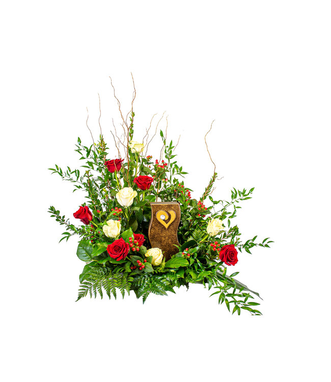 Rose asst, Hypericum berries branchu, Ruscus italien, Aspidistra, salix, Myrtle Lire plus.