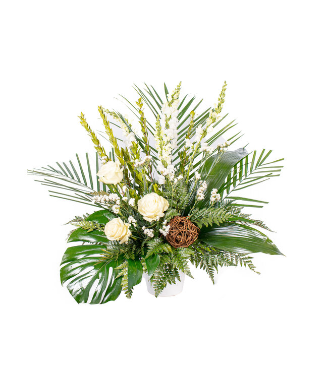 Muflier, Rose asst., Statice, Emerald long, Myrtle, Monstera, Aspidistra Lire plus.