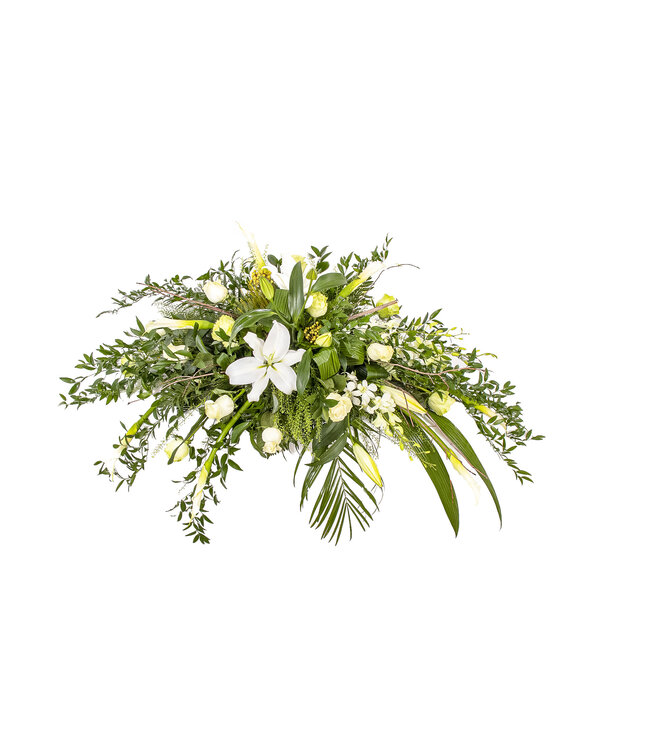 Lys callas, Lys blanc, Rose blanche, Dendrobium blanc, Ruscus italien, Ruscus israel