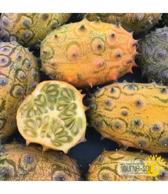 Voici un concombre cornu africain. Fruits verts virant au jaune à maturité. Mangez la chair vert-lime au goût de raisin/banane/concombre. Semez à l'intérieur 4 semaines avant de dernier gel.
