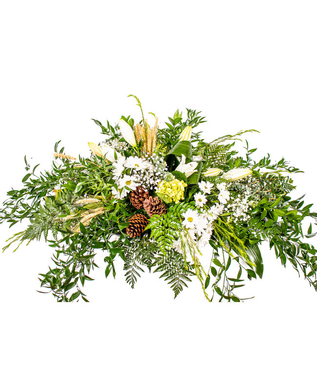 6 marguerites blanches, lys blanc, hydrangé vert, gypsophiles, aspidistra, honey bracelet, ruscus italien, ruscus israel, eucalyptus, blé, cocotte Lire plus.
