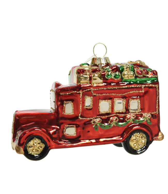 Laissez la magie de Noël prendre place dans votre décor avec cet ornement en verre en forme d’autobus rouge, symbole parfait de joie, de voyages et de moments précieux partagés.