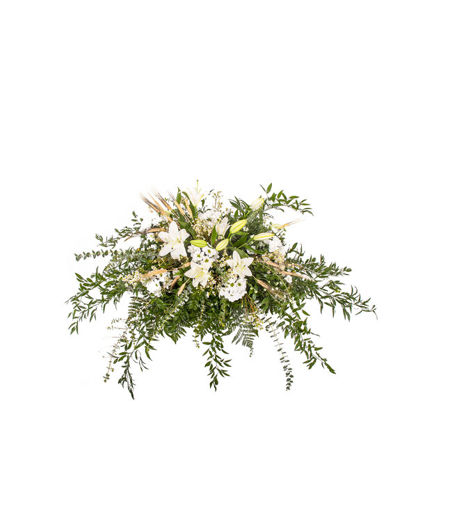 Lys blanc, marguerite blanche, wax, ruscus italien, eucalyptus, blé Lire plus.