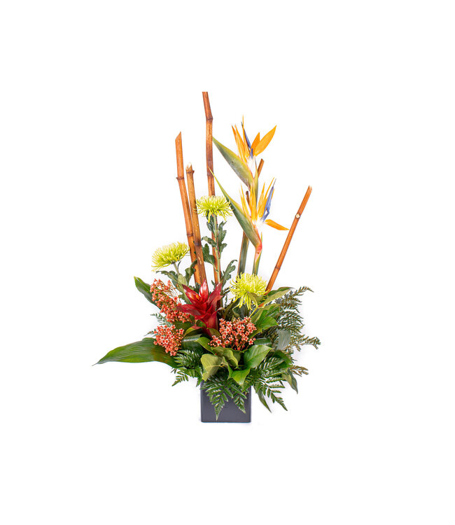 Oiseau du paradis, Guzmania, Mum fuji blanc/vert, Wax assorti, Aspidistra, Salal, Bambou Lire plus.