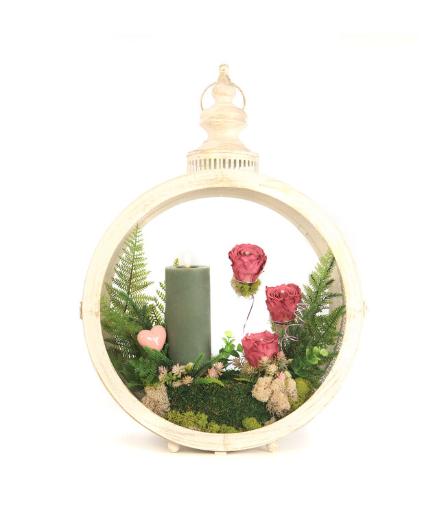 Présentée dans une lanterne au fini doux et intemporel, cette composition évoque la paix, la sérénité et la continuité du souvenir. Les roses éternelles symbolisent l’amour qui traverse le temps, tandis que la verdure et les mousses décoratives apportent une touche naturelle et apaisante.