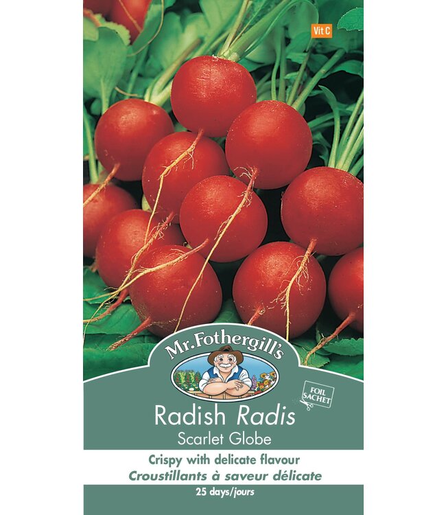Radis de 2.5cm (1po) à peau rouge vif. Semez directement au jardin dès que l'on peut travailler le sol.