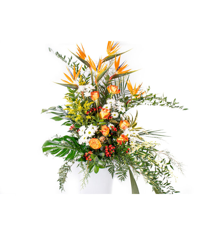Oiseau du paradis, Rose asst, solidago, Song of india, Chrysanthemum hollande, Hypericum berries branchu, Leucadendron, caroline saphir, Ruscus italien, ruscus israël, Monstera, Dendrobium blanc/bleu, Accordéon