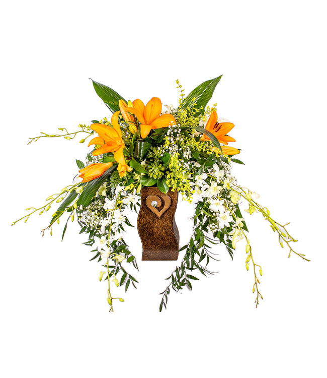 Lys asiatique, Dendrobium blanc/bleu, solidago, Gyps millions star, Ruscus italien, ruscus israël, Aspidistra Lire plus.