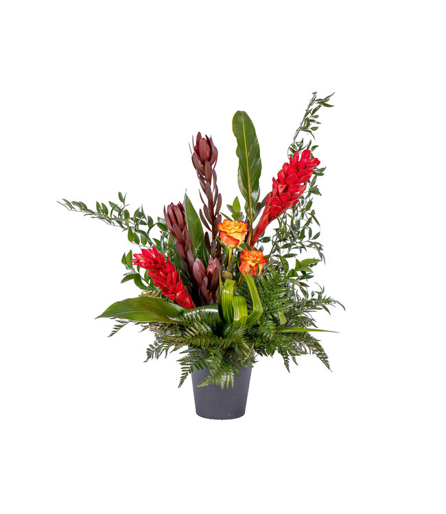 Ginger, Leucadendron, Rose asst., Accordéon, Aspidistra, Ruscus italien, Ruscus israeli Lire plus.