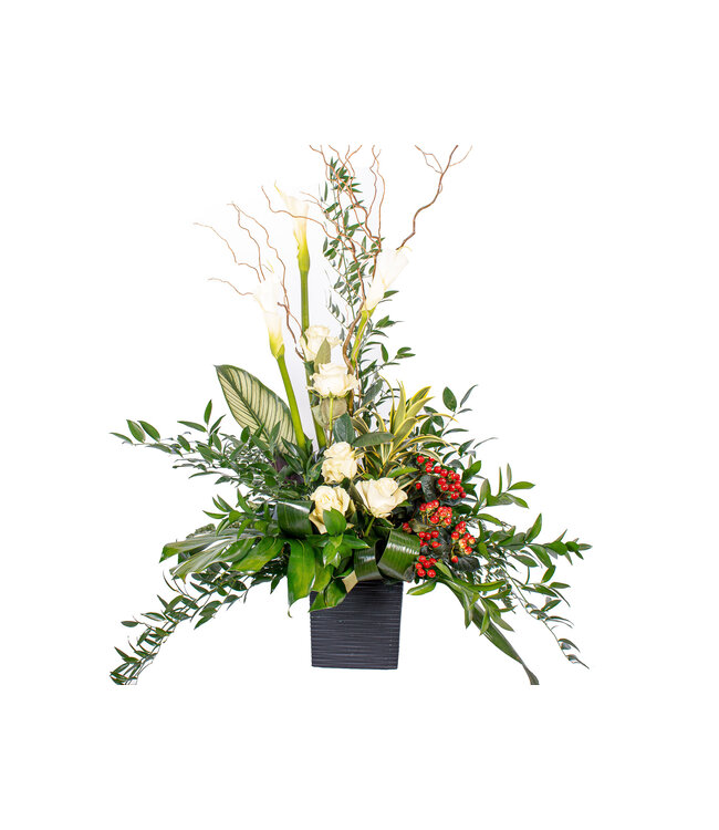 Calla blanc, Rose asst., Hypericum berries branchu, Calathea, Song of india, ruscus israël, Ruscus italien, Aspidistra, Monstera, salix