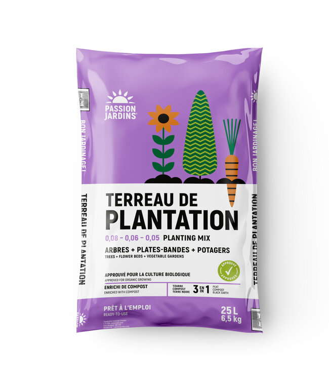 Offrez un sol riche et équilibré à vos plantes avec le Terreau Plantation Bio de Passion Jardins. Grâce à sa formulation (0,08-0,06-0,05) et son format pratique de 25 litres, ce terreau est idéal pour vos plates-bandes, vos arbres et votre potager. Enrichi de compost et composé d’un mélange 3 en 1 (tourbe, compost, terre noire), il retient parfaitement l’humidité tout en permettant une bonne aération des racines.