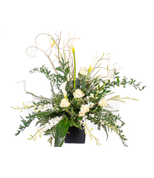 Rose asst., Calla blanc, Dendrobium blanc/bleu, Ruscus italien, ruscus israël, honey bracelet, salix, Aspidistra Lire plus.